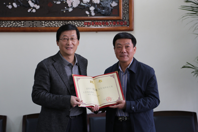 仪式上,坚增运副院长向刘江南教授详细介绍了材化学院的发展状况,张弘处长向大家介绍了刘江南教授在科学研究上取得的优异成绩。刘建勋副校长与刘江南教授签订聘任协议。由廉振民校长为受聘“客座教授”颁发聘书。