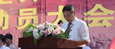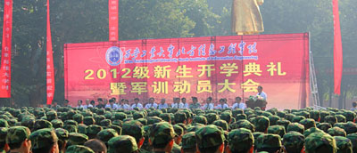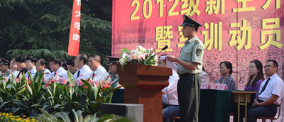 简林根作军训动员报告,他代表学院对第二炮兵工程大学承训官兵表示热烈欢迎,并对全体参训师生致以亲切问候。他指出:军训是我院教学计划的组成部分,是对学生进行全面素质教育的重要内容。希望同学们,在训练中深刻体会大学生军训的意义,服从教官指挥,虚心向教官学习。同时要求全体教官发扬部队优良作风,高标准、严要求、科学施训。全体参训干部坚持“以学生为本,树立管理育人、服务育人、环境育人、军训育人”的理念,训育结合,注重培养学生积极健康的思想情操,坚定不移的政治信念,爱国卫国的牺牲精神。他预祝北信学院2012级学生军训圆满成功。