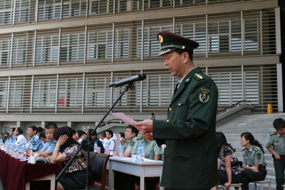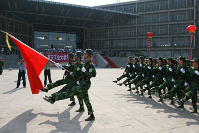 9点30分,大会在庄严的国歌中拉开了帷幕,接着各个方阵的参训学生满怀信心地接受了校长廉振民的检阅。在特定的节奏下,各连队进行了分列式阅兵。随后,由各方阵进行军事训练项目表演,整齐划一的示范连表演,训练有素的刺杀操表演,英姿飒爽的女子军体拳表演,气势恢宏的匕首术表演,赢得了大会现场阵阵掌声。最后,全体教官进行了倒功擒拿格斗术表演,他们精湛的表演令同学们连连喝彩。