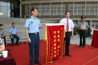 由军训旅政委杨正强宣读表彰决定,与会领导向先进集体颁奖。空军工程大学理学院副政委童胜良大校进行了讲话,买球党委书记赛云秀、校长廉振民分别向空军工程大学理学院和训练部赠送了锦旗。