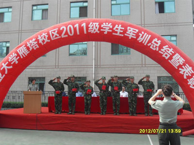 操场上,7个学生方阵排列整齐,军容严整。“首长好!”“为人民服务!”……伴随着激昂嘹亮的口号,11级全体同学个个精神抖擞、士气高昂地接受领导检阅。在随后的分列式上,7个阅兵方队在雄伟的人民解放军军歌中一一走过主席台。同学们昂扬的斗志、严整的军容、响亮的口号、整齐的步伐,充分展现了为期16天军事训练的丰硕成果和蓬勃向上的精神面貌。在接下来进行的女子擒敌拳、男子刺杀操、女生班教练列和枪械分解结合四个军事课目表演中,同学们一招一式都威武有力,一拳一脚都铁骨铮铮,精彩的表演赢得了在场领导和师生的热烈掌声。