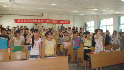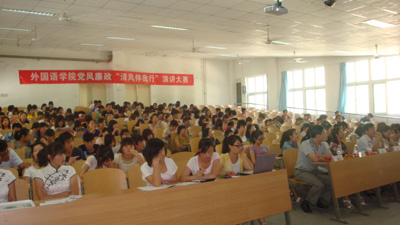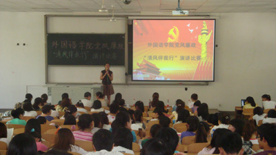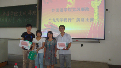 开场白之后,主持人宣布“清风伴我行”演讲比赛开始。参赛选手依次上台演讲,他们结合自身特点和生活实际,发表自我观点,表达了各自对党风廉政建设的理解,对反腐倡廉工作的支持,以及对如何做一个清正廉洁人的看法。让本来似乎与现实生活离得很远的话题亲切实在的呈现在观众眼前。赛场上不时响起热烈的掌声和喝彩声,选手们凭借流畅的语言,声情并茂的表现征服了在座的观众和评委。选手中既有外国语学院的教师党员,也有学生党员,他们幽默风趣的语言,入情入理的论证,贴近实际的举例,令在场的观众深刻理解了党风廉政建设的意义,弘扬清正廉洁的价值,许多同学都感受颇深,收获颇丰。
