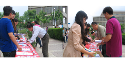 为增强宣传效果,总务处准备了宣传横幅、签名横幅,安全知识手册等资料。当每一位学生或教职工经过宣传台时,宣传人员主动向他们发放防灾减灾安全知识手册,宣讲防灾安全知识的必要性和重要性。同时,请师生们在写有“弘扬防灾减灾文化,提高防灾减灾意识”的横幅上签名,不到一个小时的时间,条幅上就已经签满了师生们的名字。