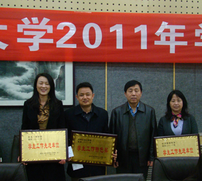 纪委书记许尚年分别为获得2011年度学生工作先进单位荣誉称号的机电工程学院 、经济管理学院和获得2011年度学生工作特色奖荣誉称号的材料与化工学院颁发奖牌和奖金。他在对获得表彰奖励的单位表示祝贺的同时,肯定了买球的学生工作。结合目前高校安全稳定形势,他指出:一定要加强学生的日常管理,确保教育到位,管理到位,维护学校安全稳定大局。