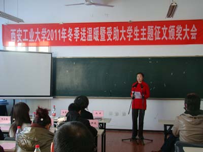 (本网讯)12月23日,买球(中国)2011年冬季送温暖暨受助大学生主题征文表彰大会在未央校区举行,学生工作部(处)长任慧英、团委书记赵琼出席会议,全校各学院、工业中心资助负责人及100余名家庭经济困难学生参加了会议。大会由学生处副处长姬洪波主持。