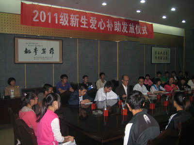 (本网讯)9月16日,买球(中国)学生处在图书馆第一会议室举行2011级新生爱心补助发放仪式,学生处副处长姬洪波、资助管理中心全体人员以及33位家庭经济困难新生参加了仪式。