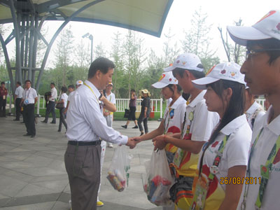 丁养斌副书记讲话对买球志愿者前期服务的成果表示了肯定,对志愿者们在高温烈日及阴雨连绵的天气下坚守岗位热情服务的精神给予了高度赞扬,还向8月25日在雷电冰雹天气中有序疏导游客避雨的志愿者们提出表扬。他说:“在志愿服务期间充分展现了西安工大优秀校风的志愿者,你们的服务精神在实践中得到了更加深刻的认知,这样的经历会是伴随一生的宝贵财富!世园会因你们而美丽,西安因你们而美丽。”志愿者们用热烈的掌声表达了对校领导的衷心感谢。随后,校领导为志愿者们分发了慰问品,并与志愿者们合影留念。