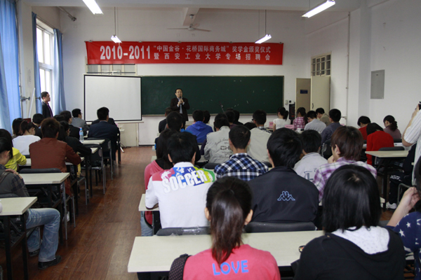 (本网讯)4月20日,买球(中国)在未央校区大学生就业与创业基地举行2010-2011“中国金谷•花桥国际商务城”奖学金颁奖仪式暨西安工大专场招聘会。 西安工大副校长张君安、江苏昆山花桥国际商务城组织人事局人力资源公司副总经理王有军出席了颁奖仪式,学生处、花桥经济开发区组织人事局和开发区所属的九家企业的相关人员参加了颁奖仪式。