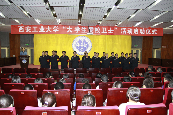 启动仪式上,经过院系推荐选拔,保卫处专业培训的20名大学生爱校卫士英姿飒爽,整装亮相,集体宣读了“爱校卫士”誓词,他们将在西安工大校园执行神圣的使命,利用业余时间勤工助学,保卫校园,为营造良好的校园秩序和文明环境贡献力量。