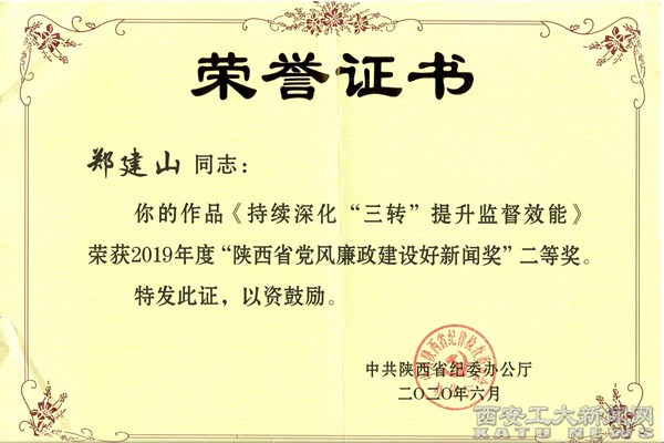 (本网讯)日前,2019年度陕西省党风廉政建设好新闻奖评选揭晓,买球党委副书记、纪委书记、监察专员郑建山撰写的文章《持续深化“三转”提升监督效能》荣获2019年度“陕西省党风廉政建设好新闻奖”二等奖,是全省高校中唯一获奖单位。
