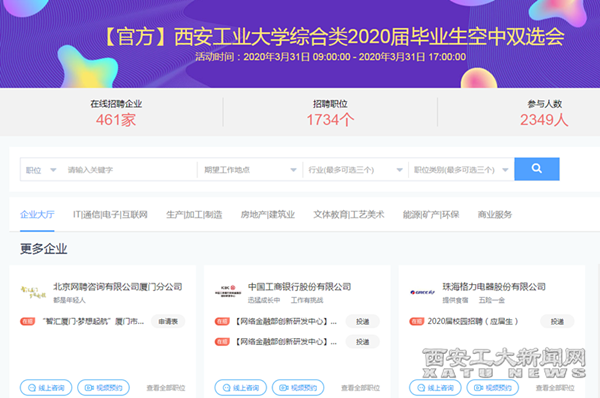 (本网讯)3月31日,买球举办2020届毕业生春季综合类空中双选会(第二场)。本次空中双选会参会企业共461家,提供就业职位1734个,就业岗位34043个。参会企业主要以民营企业、国有企业、股份制、上市公司为主,主要涉及房地产建筑、IT通信、生产制造、教育培训、能源环保等行业领域,参会规模,参会企业数量创学校网络双选会之最。