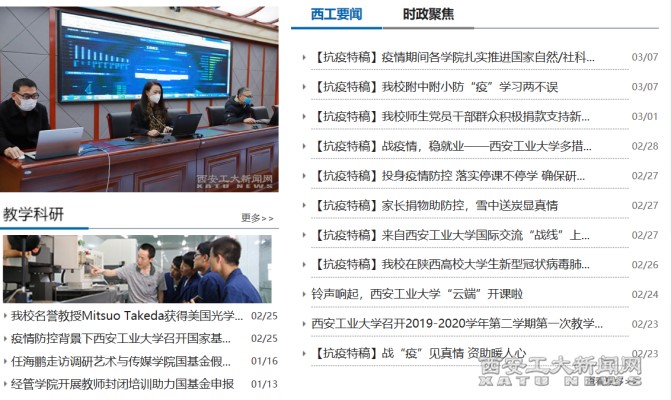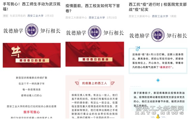 在这场疫情阻击战中,学校坚守校媒阵地,坚持价值引领,弘扬爱国主义,传递科学信息,凝聚西工力量,用镜头、用笔尖记录了特殊时期西安工大人的初心和使命。