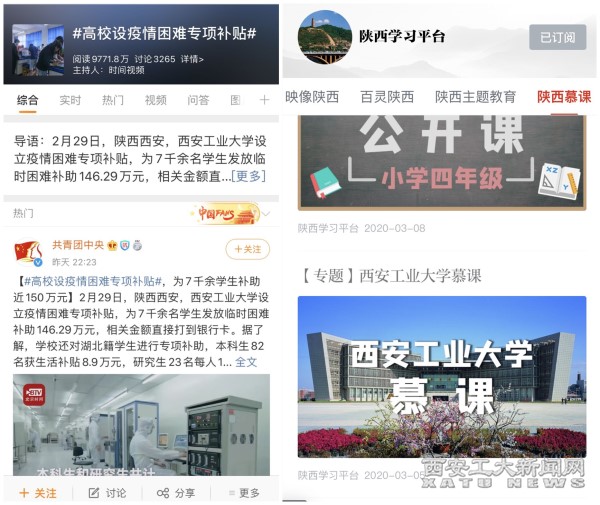 立足高标准、着眼新形势,主流媒体报道增强学校影响力。2月29日,“买球(中国)设立疫情困难专项补贴,为7千余名学生发放146余万元补助”的话题出现在微博热搜第一位,收获人民视频、环球时报、中国日报、共青团中央官方微博等一大批媒体的广泛关注,总阅读量已破亿。学习强国平台宣传报道《战疫情 校长说|买球(中国):待冬天终被逾越,再笑谈春满未央》,校长语录响彻学子心间。机械设计基础等四门特色慕课登陆学习强国陕西学习平台,停课不停学。官方微博和央视新闻官博联合互动“央视春晚临时增加抗肺炎”等话题,发布相关信息和热评50余条。央视频媒体矩阵发布西工学子为武汉加油的暖心视频,收获了良好的传播效果。疫情防控以来,陕西日报、人民网、中青在线等各类媒体先后报道买球抗疫举措、先进事迹和优秀网络文化作品70余篇次。